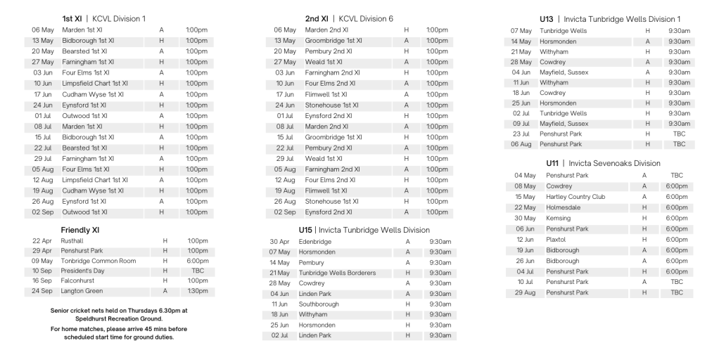 Fixtures are on Play Cricket and Spond, but if you’re traditionally-minded there are still fixture cards available. Pick one up at your first match, or download the PDF here.